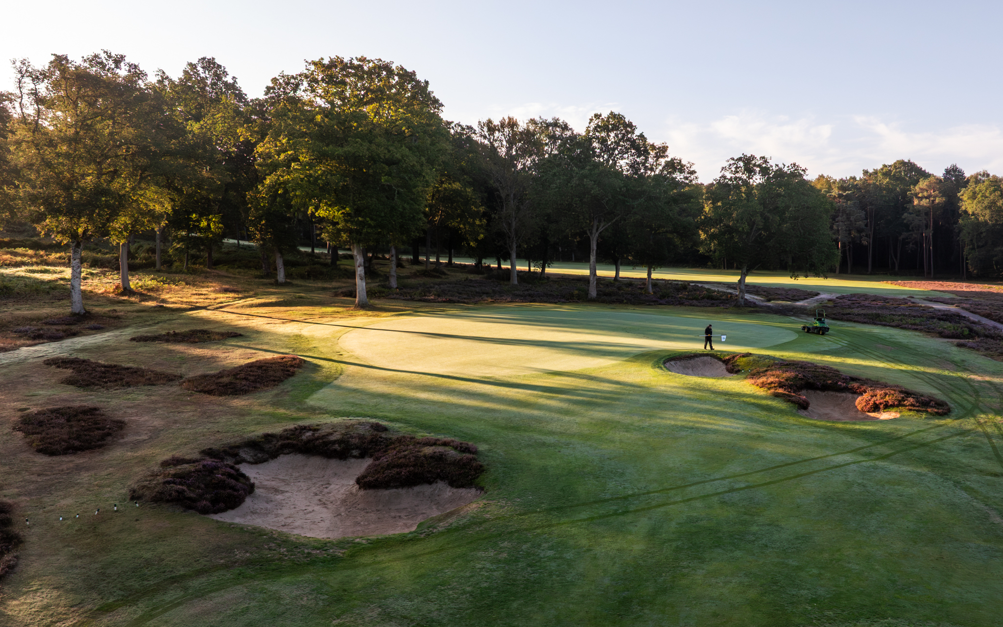 A long par 4 and a very challenging hole. The drive is a demanding shot over heather to cross a stream which meanders diagonally from left to right. A drive taking the safer route to the left of the fairway will have a very long second, slightly uphill, over a cluster of bunkers protecting the green. A drive on the right hand side will find that the stream runs increasingly into play The large slightly convex sloping green has many deceptive borrows.
