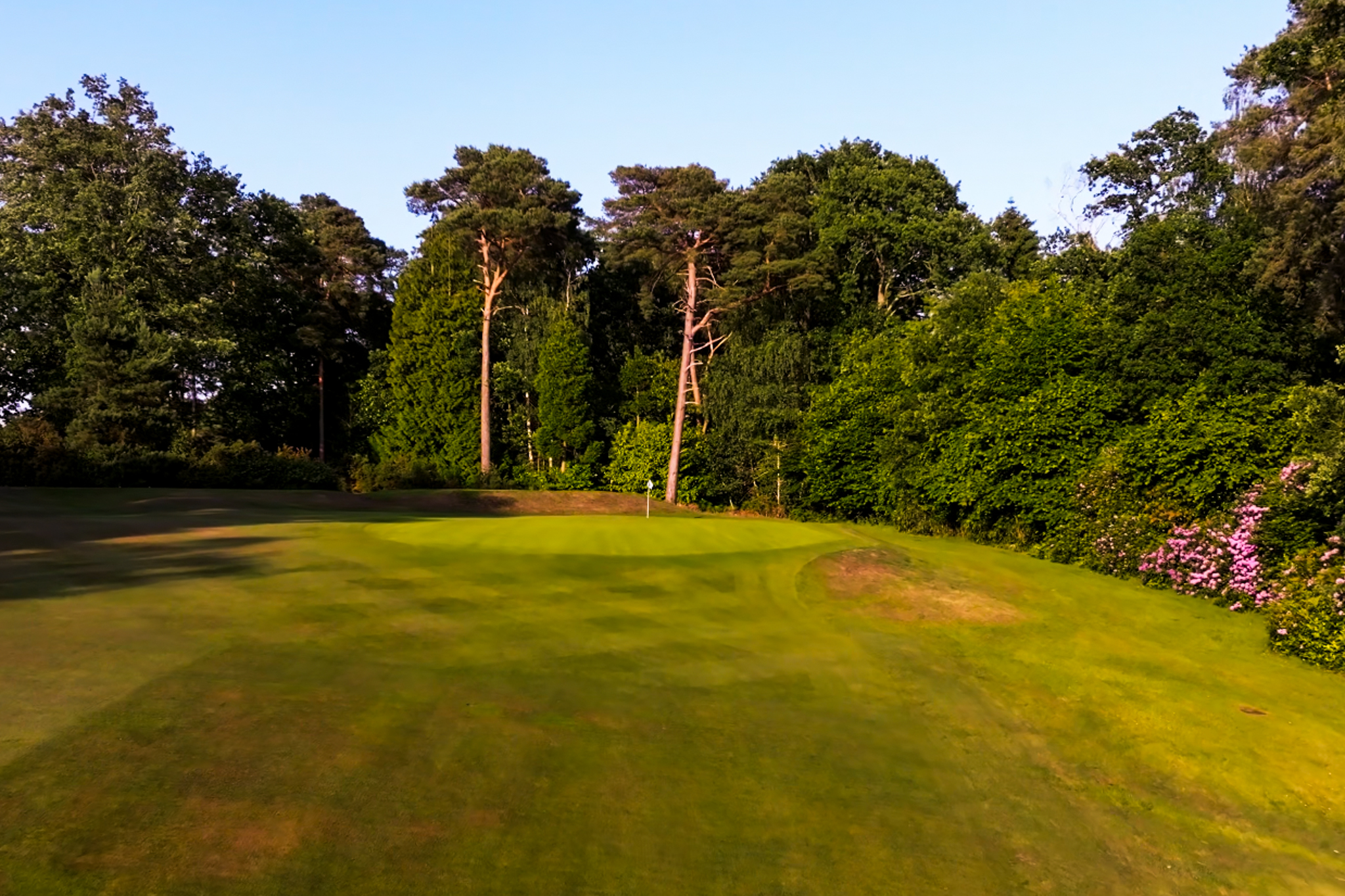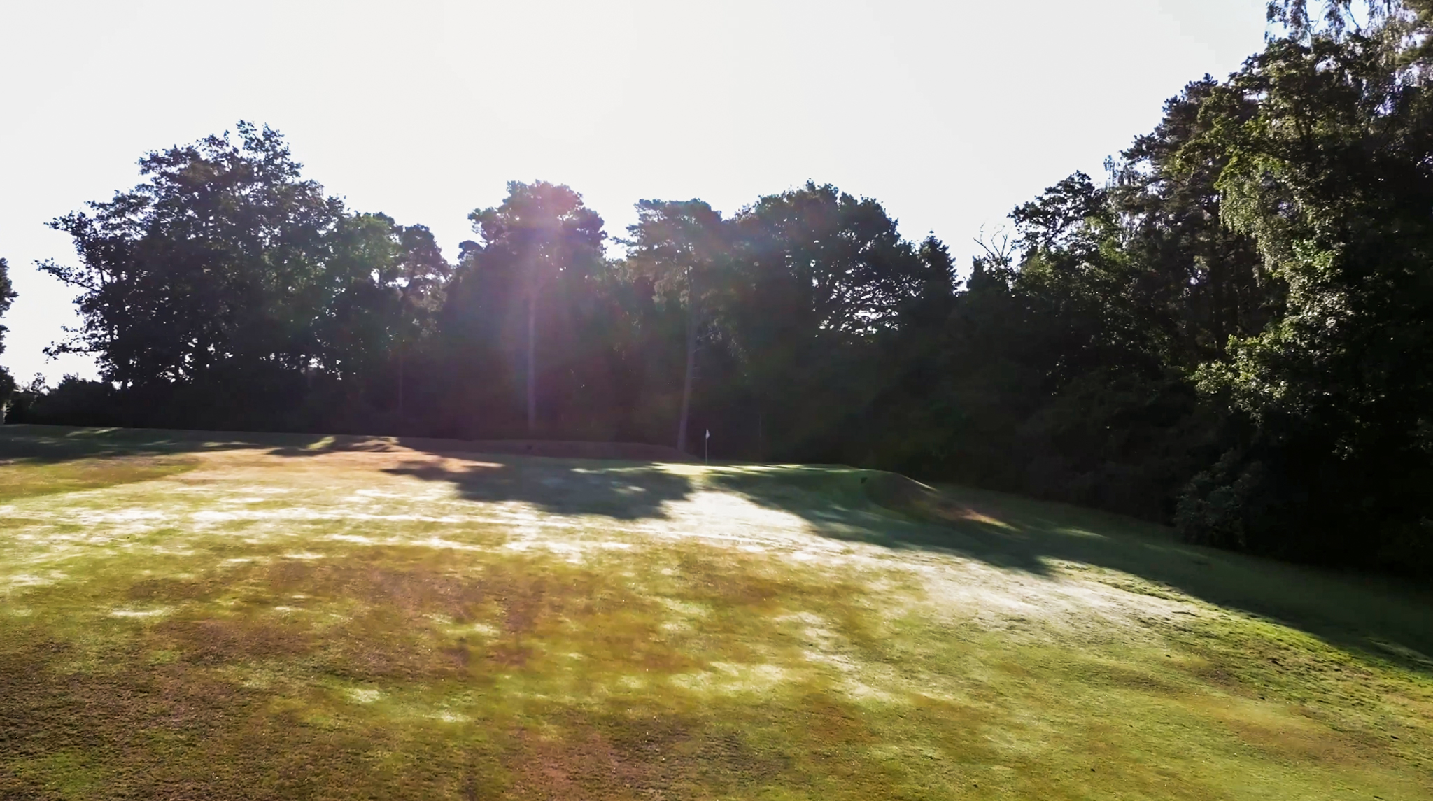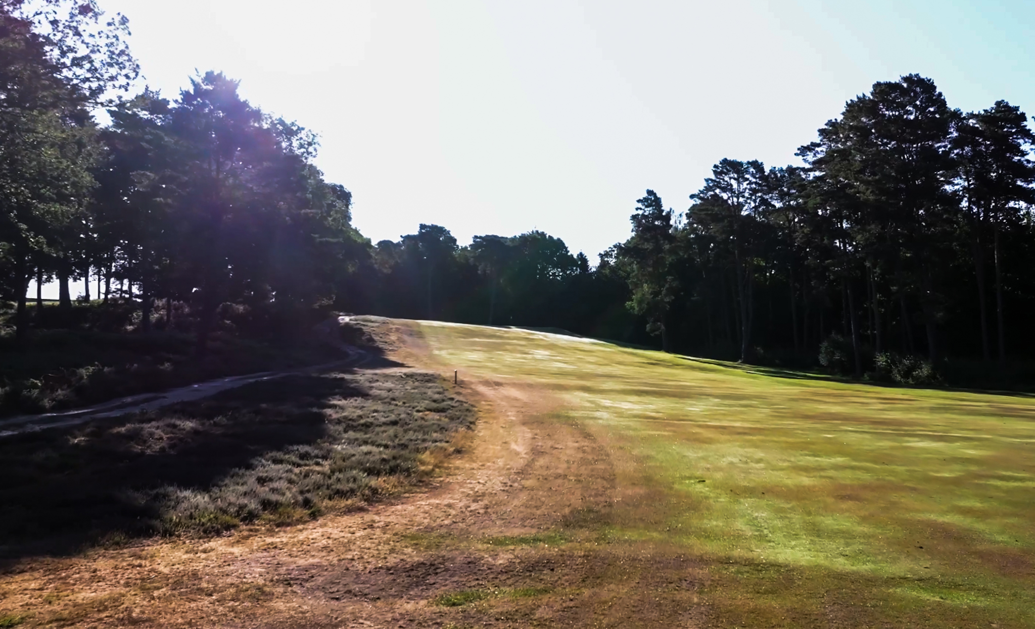 The long uphill dogleg is the only bunker-free hole on the course. From the back tees a well hit drive is needed to go past the pine tree at the turn of the dogleg. A long uphill second shot is required in order to reach the green, which at any time of the year can be very difficult, but especially in summer. The fast green slopes steeply and diagonally from back left to front right.