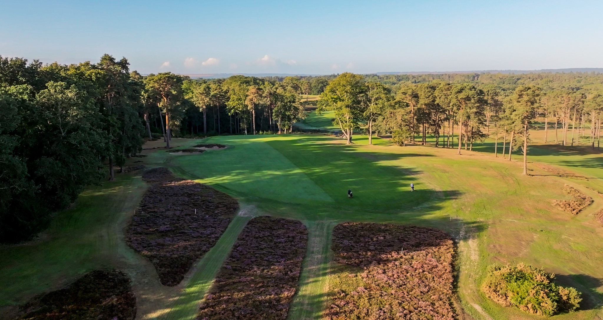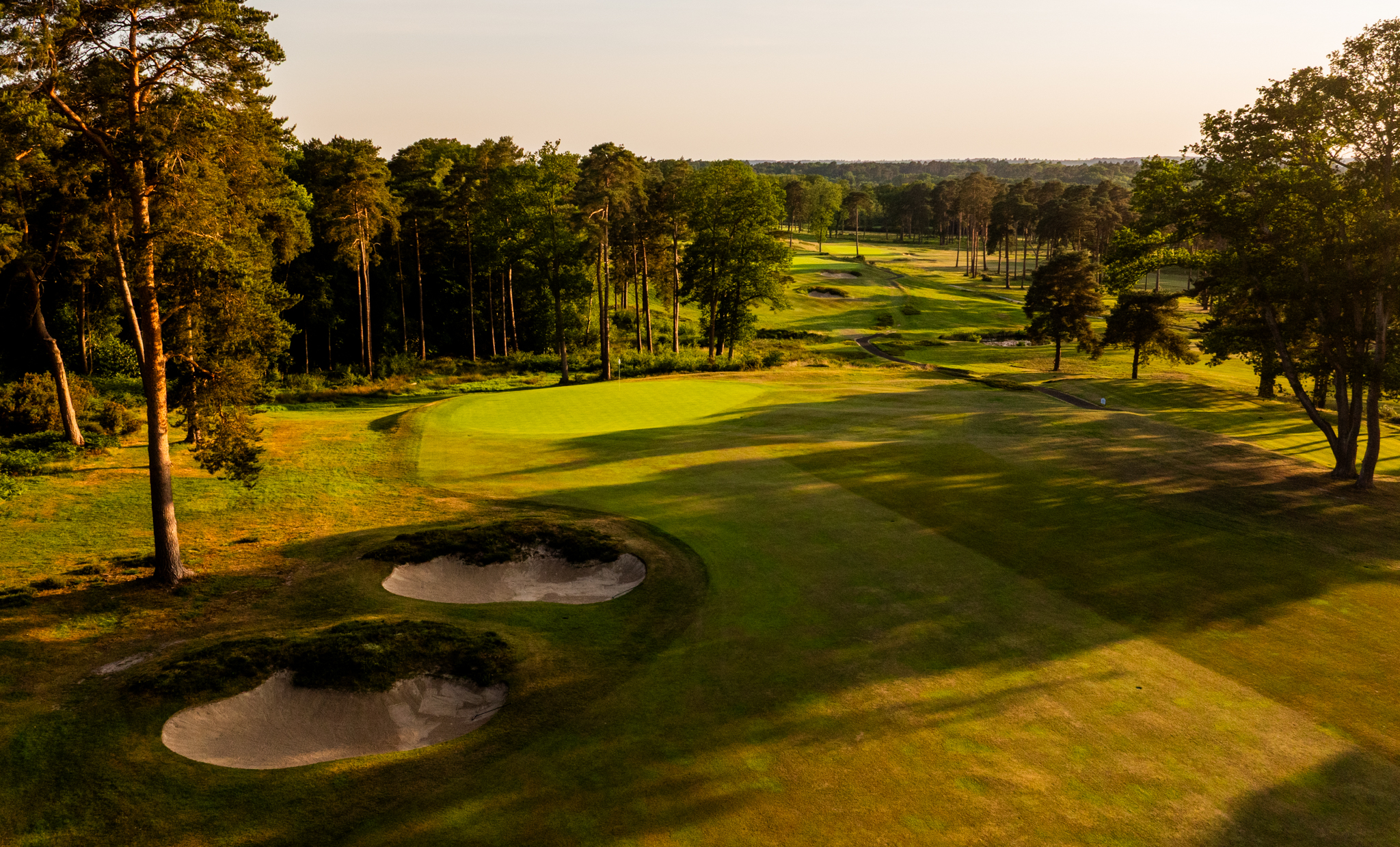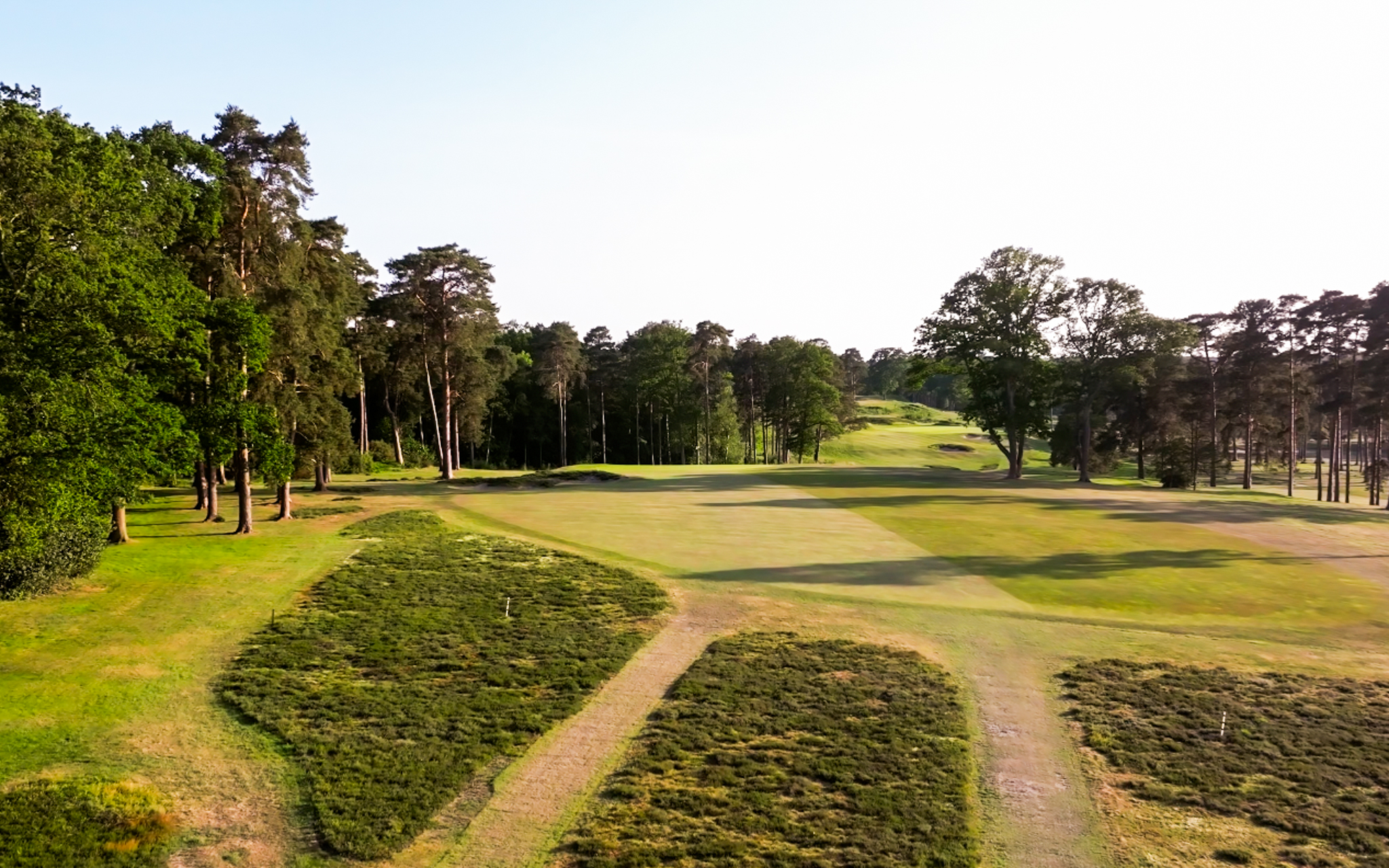 A relatively short opening hole. An accurate drive is required to avoid two partially hidden bunkers on the left of the fairway and an alcove of trees to the right. The green slopes steeply and relentlessly to the back with a steep bank beyond.
